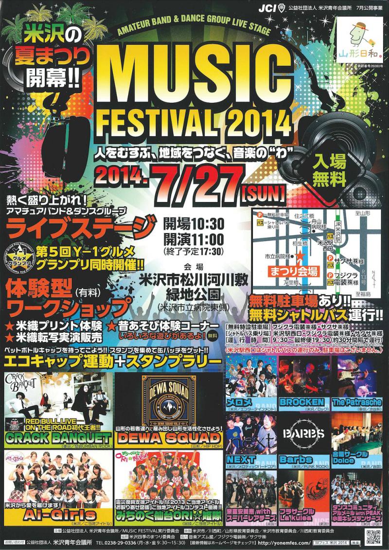 第5回y-1グルメグランプリ同時開催!アマチュアバンド&ダンスグループの多彩なライブステージ体験型ワークショップエコキャップ運動+スタンプラリー無料駐車場無料シャトルバス運行いたします。 画像 (小 中 大)2014.07.03:yonezawa