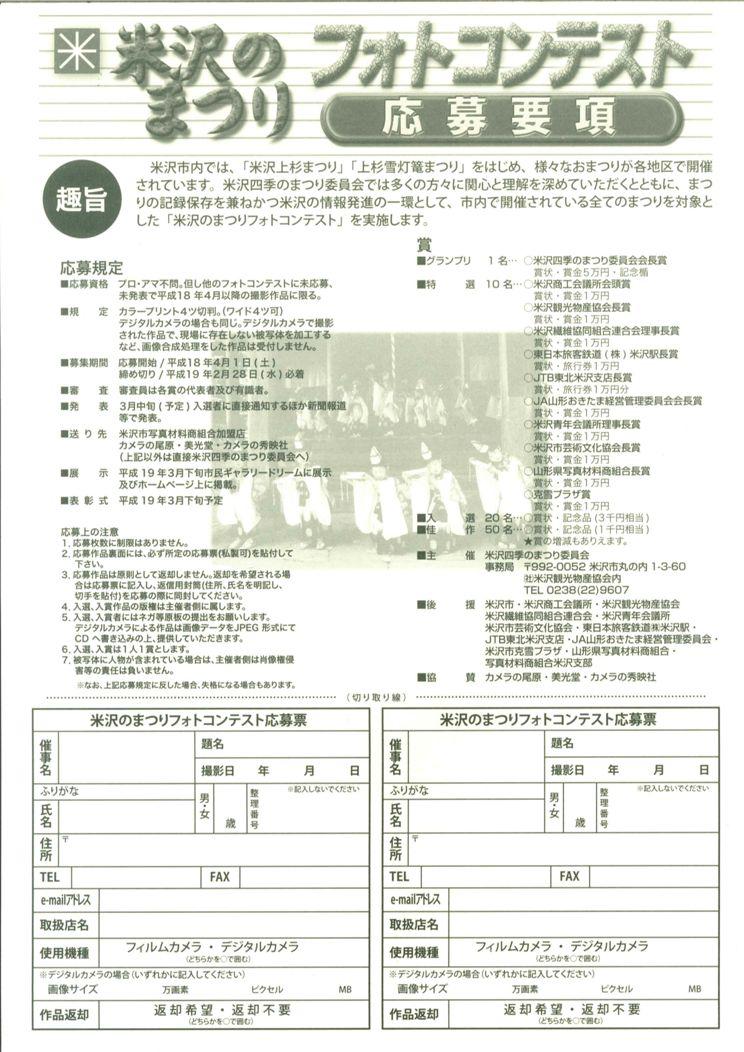応募表の付いた応募要項は米沢観光物産協会事務局 協賛の各カメラ店に置いてあります。